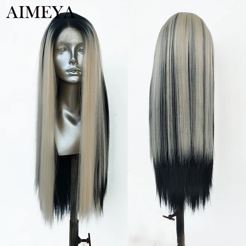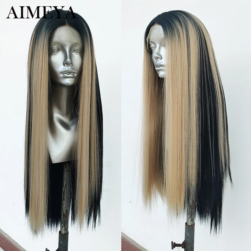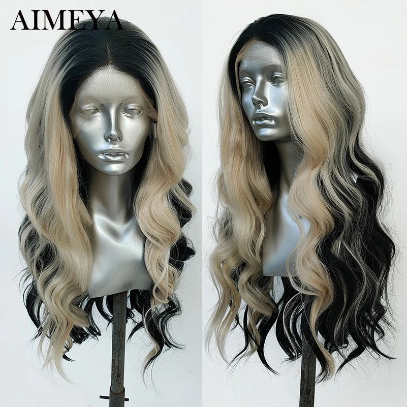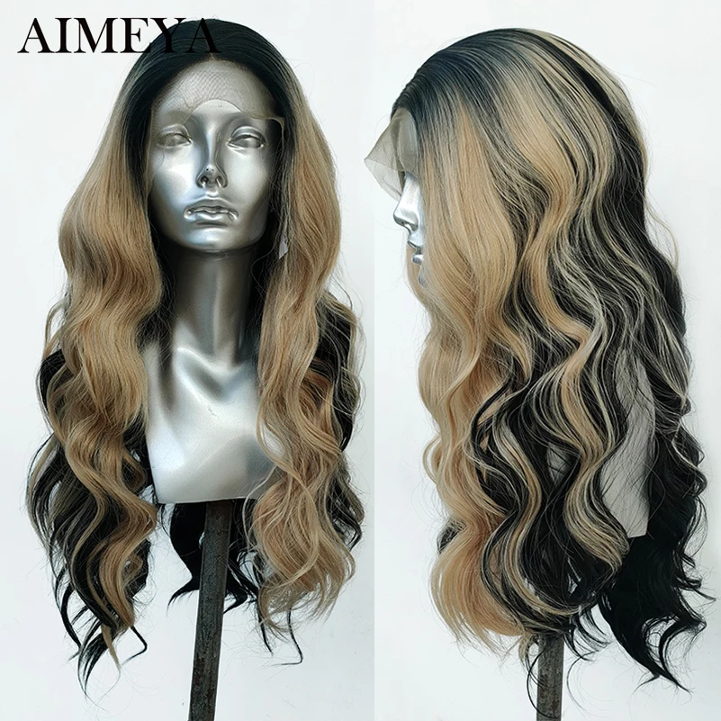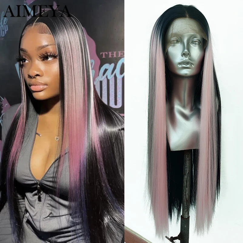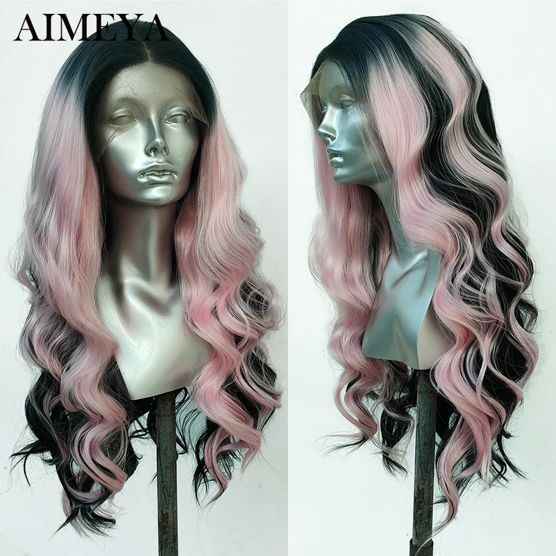 AIMEYA Synthetic Lace Wig Highlight Lace Front Wigs Body Wave Omber Black/Pink Lace Frontal Wigs High Temperature Fiber Wigs