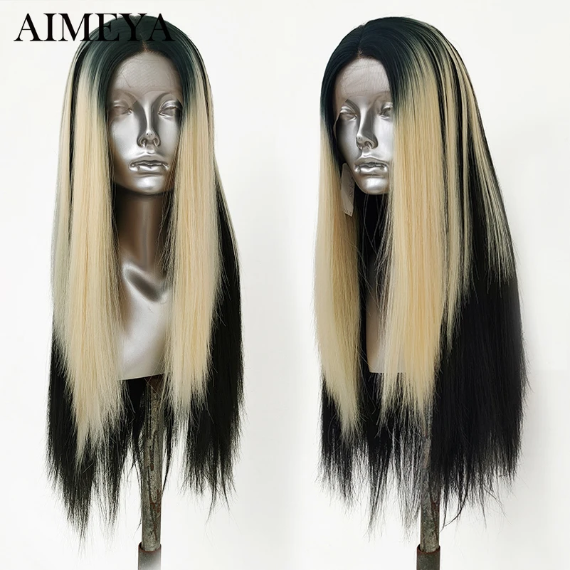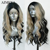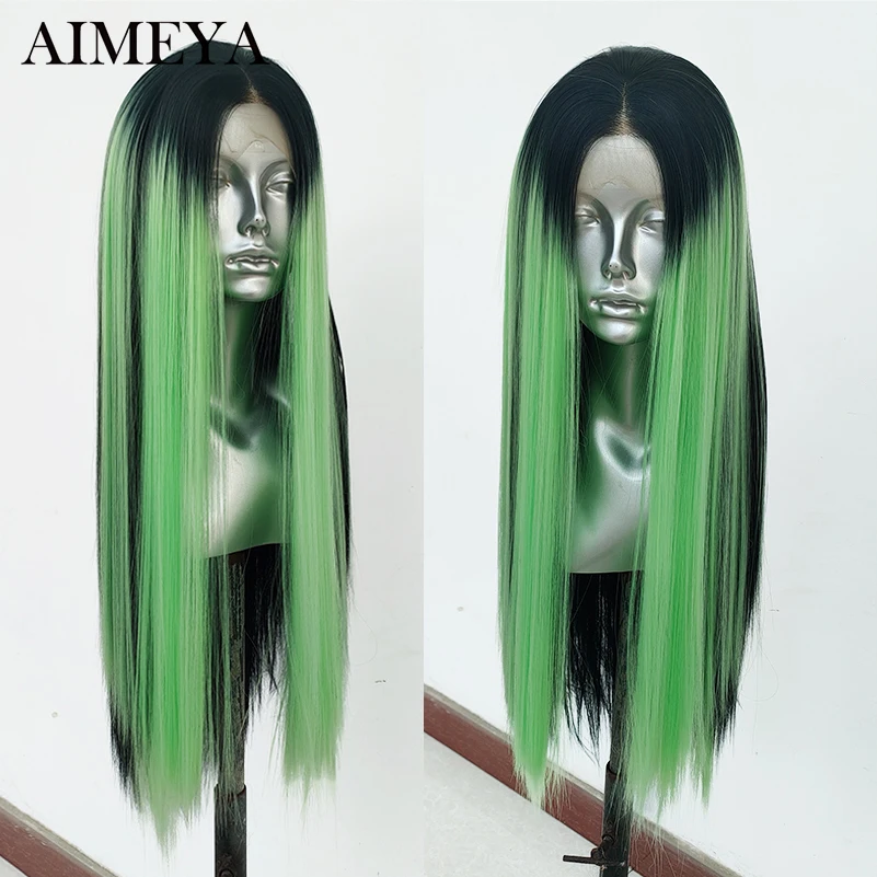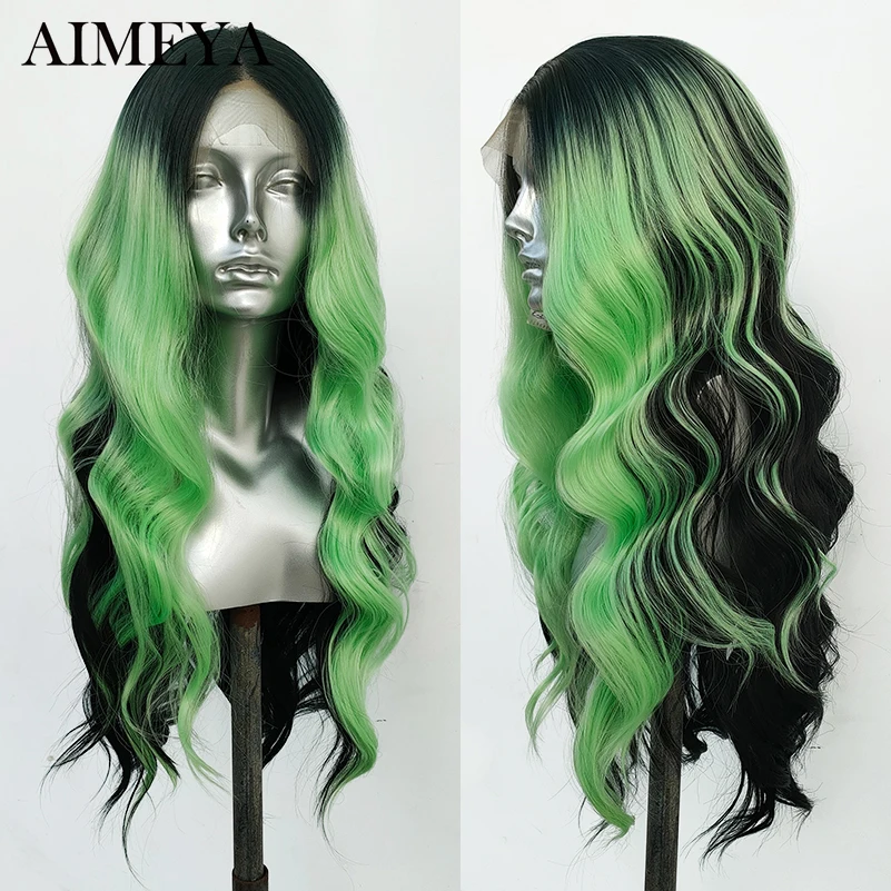 AIMEYA Synthetic Lace Wig Highlight Lace Front Wigs Body Wave Omber Black/Green Lace Frontal Wigs High Temperature Fiber Wigs