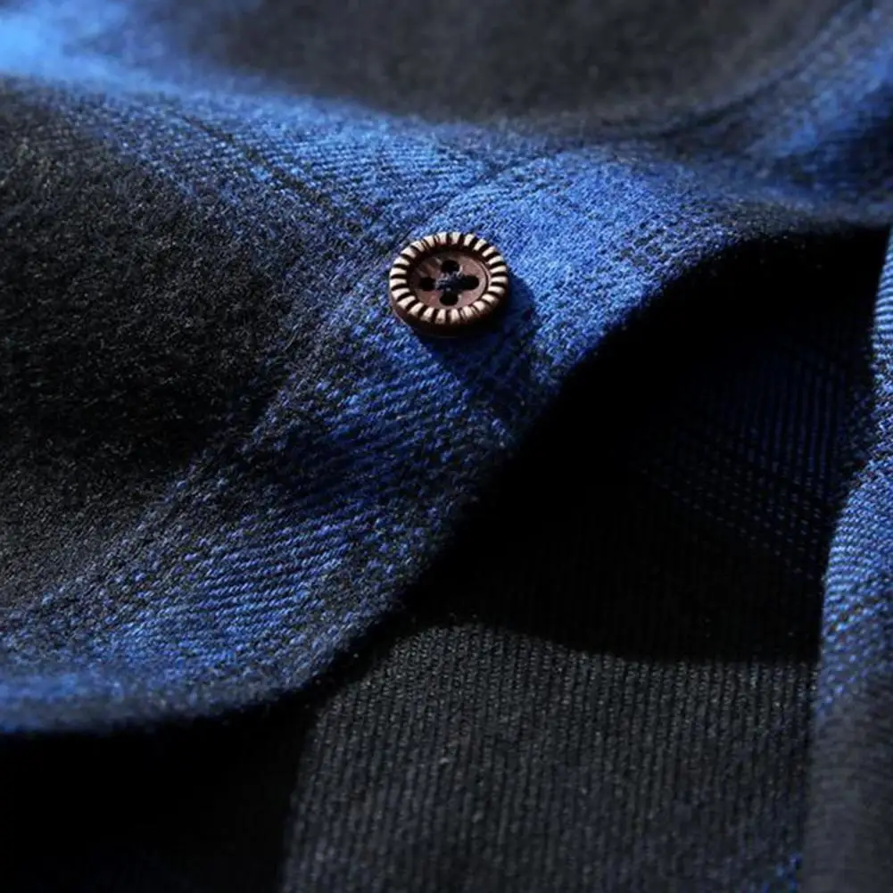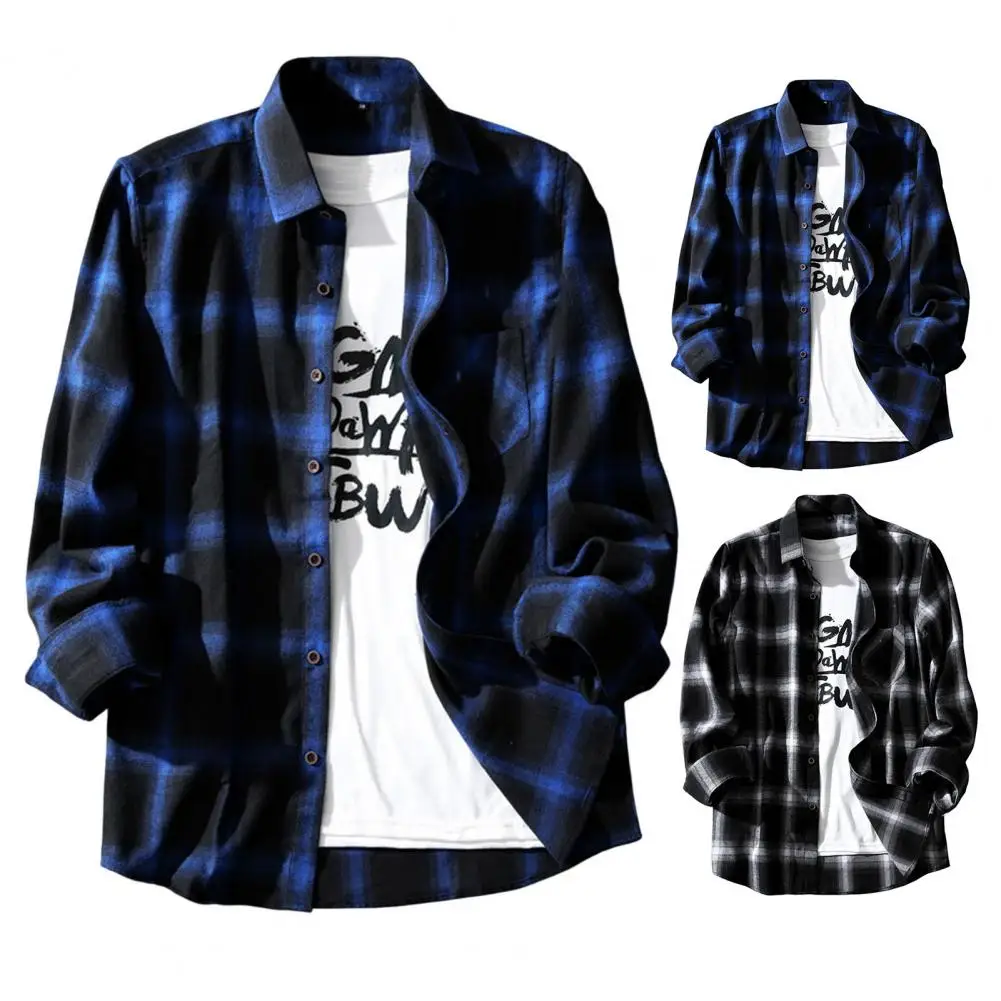 Men Spring Shirt Plaid Print Long Sleeves Contrast Colors Turn-down Collar Lapel Warm Single-breasted Color Matching Buttons Autumn Coat for Daily Wear