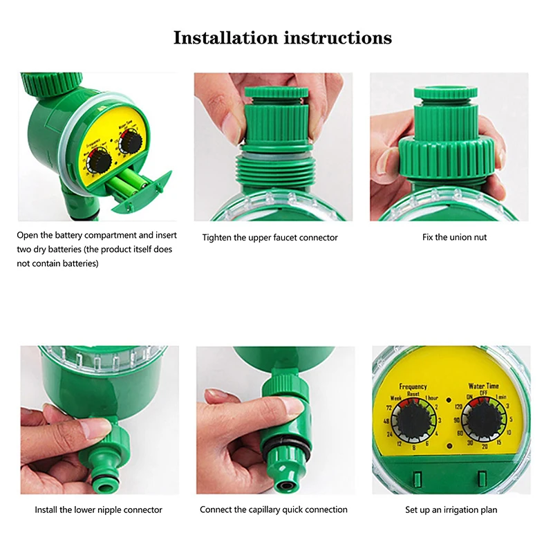 * Installation Steps: 1. Open the battery slot and insert two dry batteries (the product itself does not contain batteries) 2. Tighten the upper faucet connector 3. Fix the union nut 4. Install the lower nipple connector 5. Connect the capillary quick connection 6 .Set up an irrigation plan.