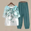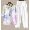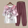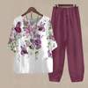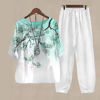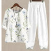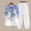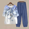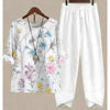 Ladies Elegant Vintage Suit Butterfly Print White Two Piece Set Casual Female Loose Outfits O Neck Short Sleeve Shirt With Pants