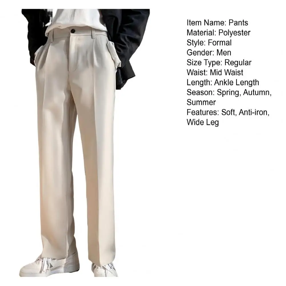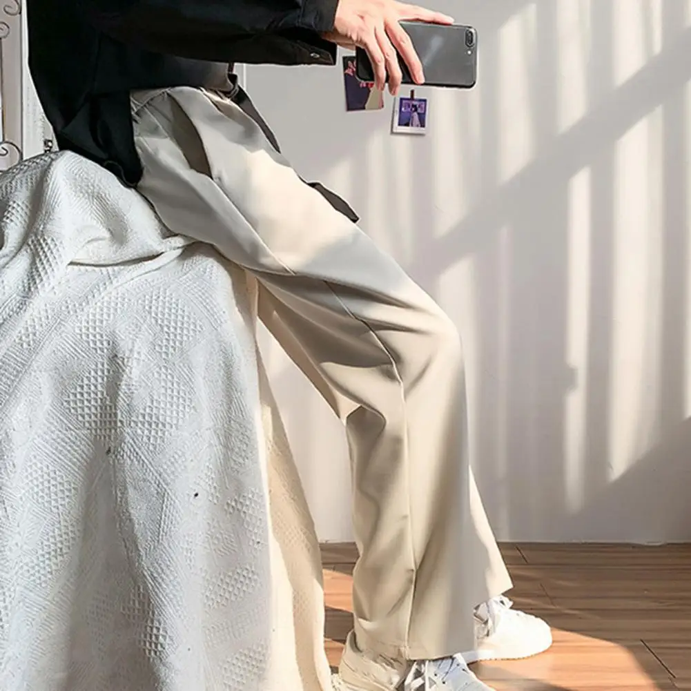 Men Pants Straight Loose Solid Color Wide Leg Suit Pants Anti-wrinkle Match Shirt Pockets Zipper Deep Crotch Pants Men Clothes