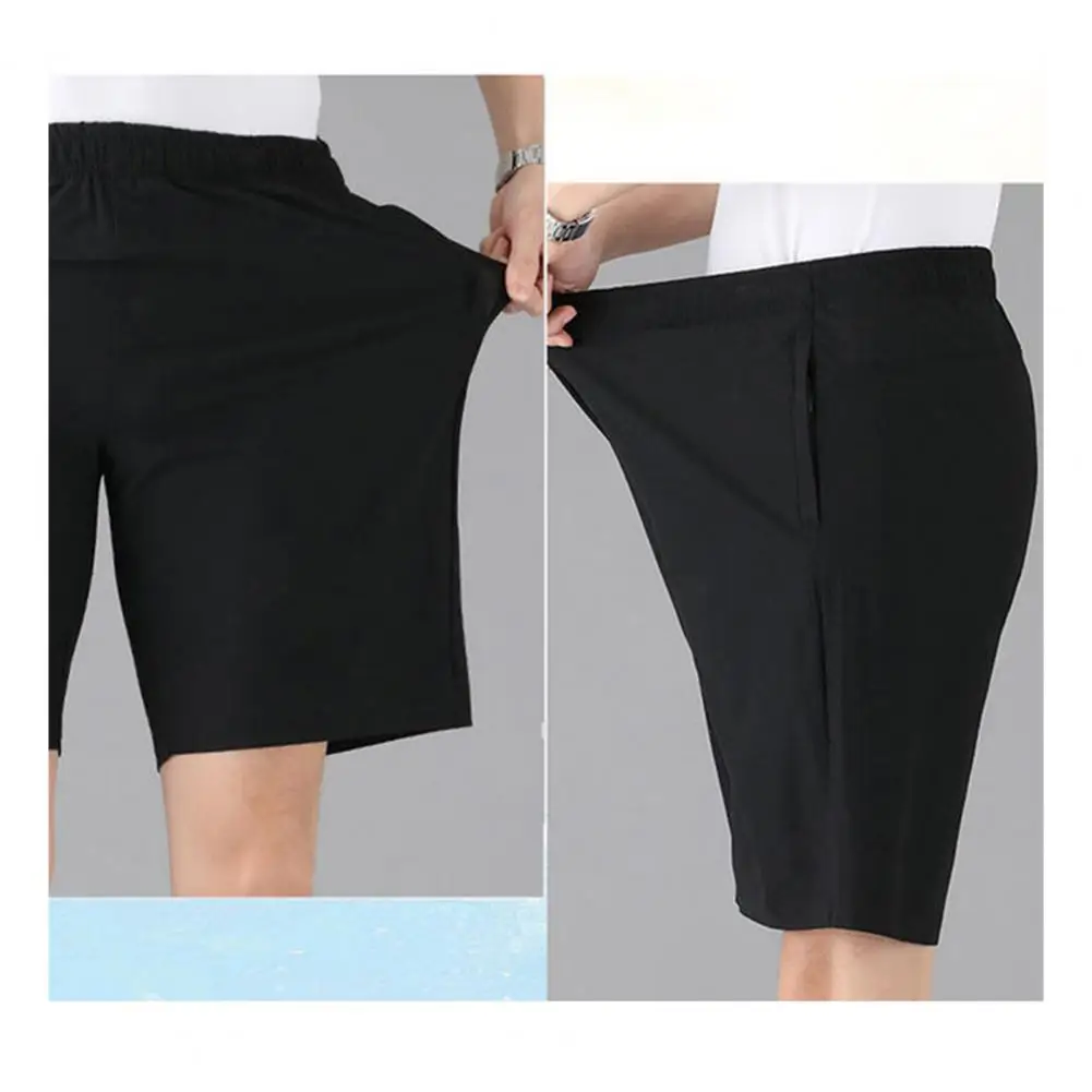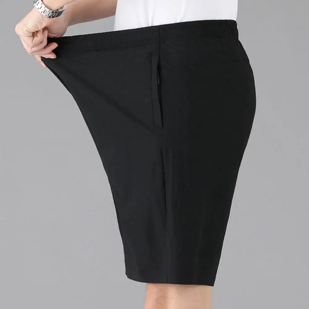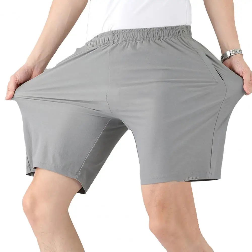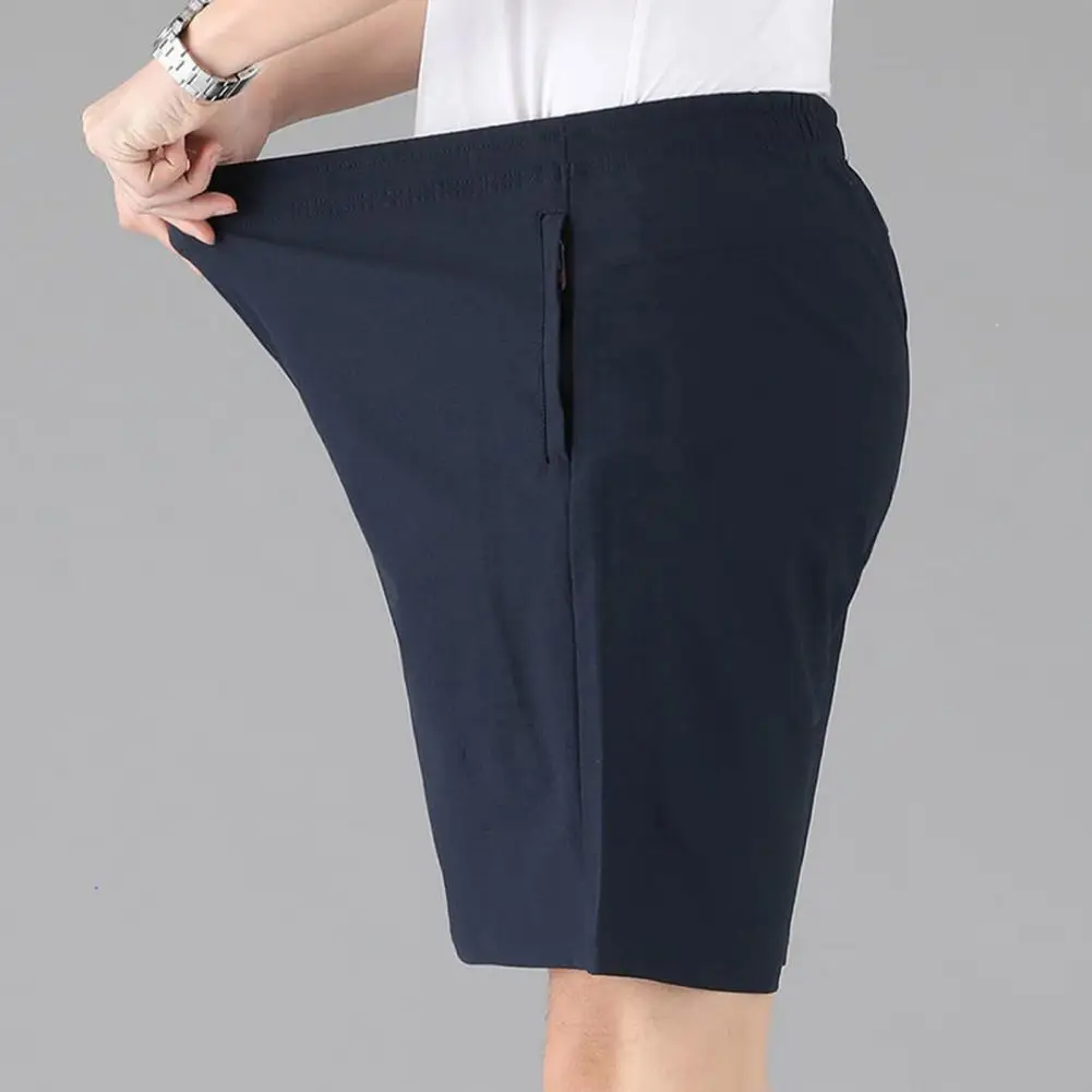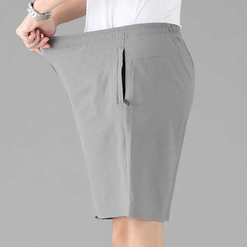 High-Waist Elastic Waistband Men Shorts Zipper Pockets Wide Leg Solid Color Mid-aged Ice Silk Sports Shorts