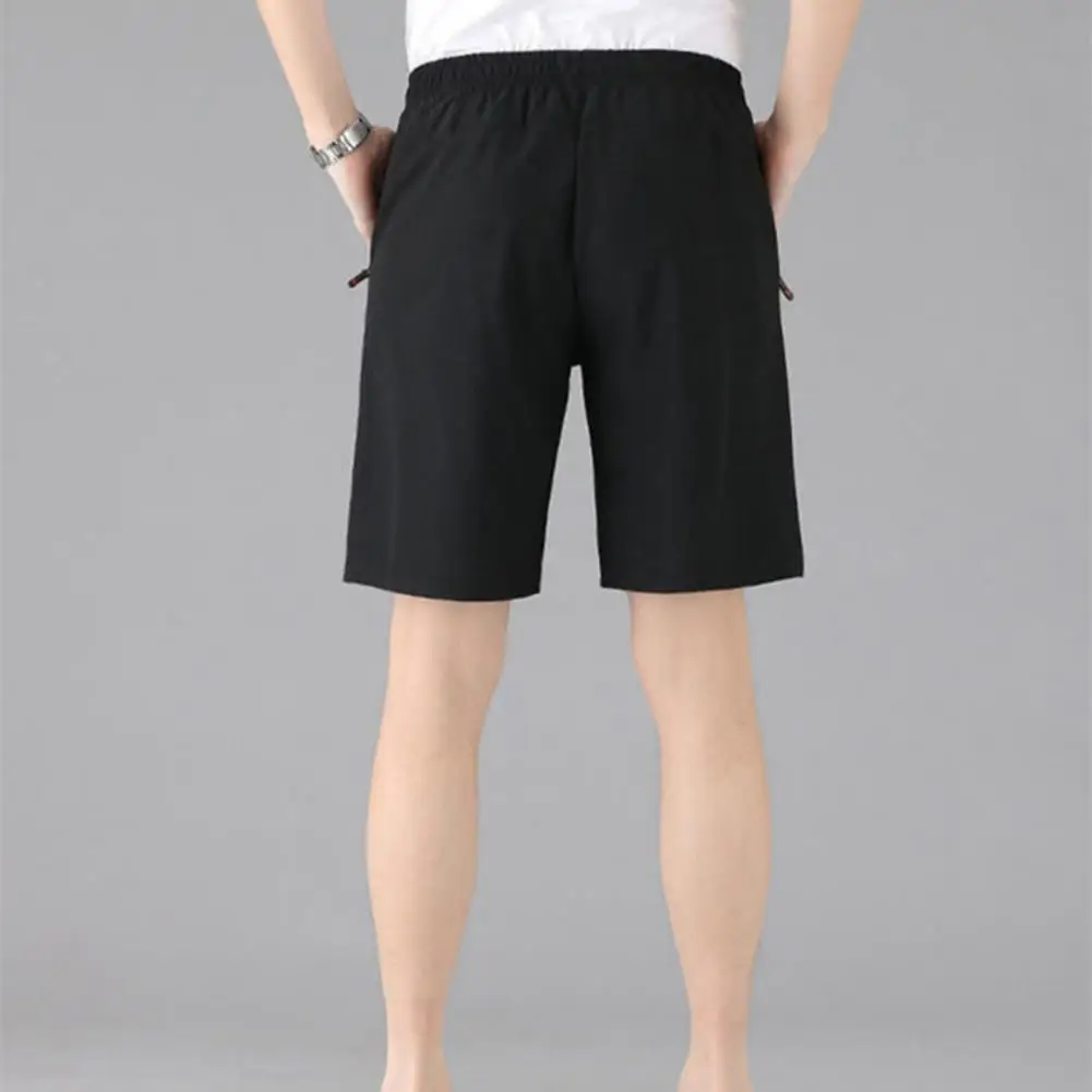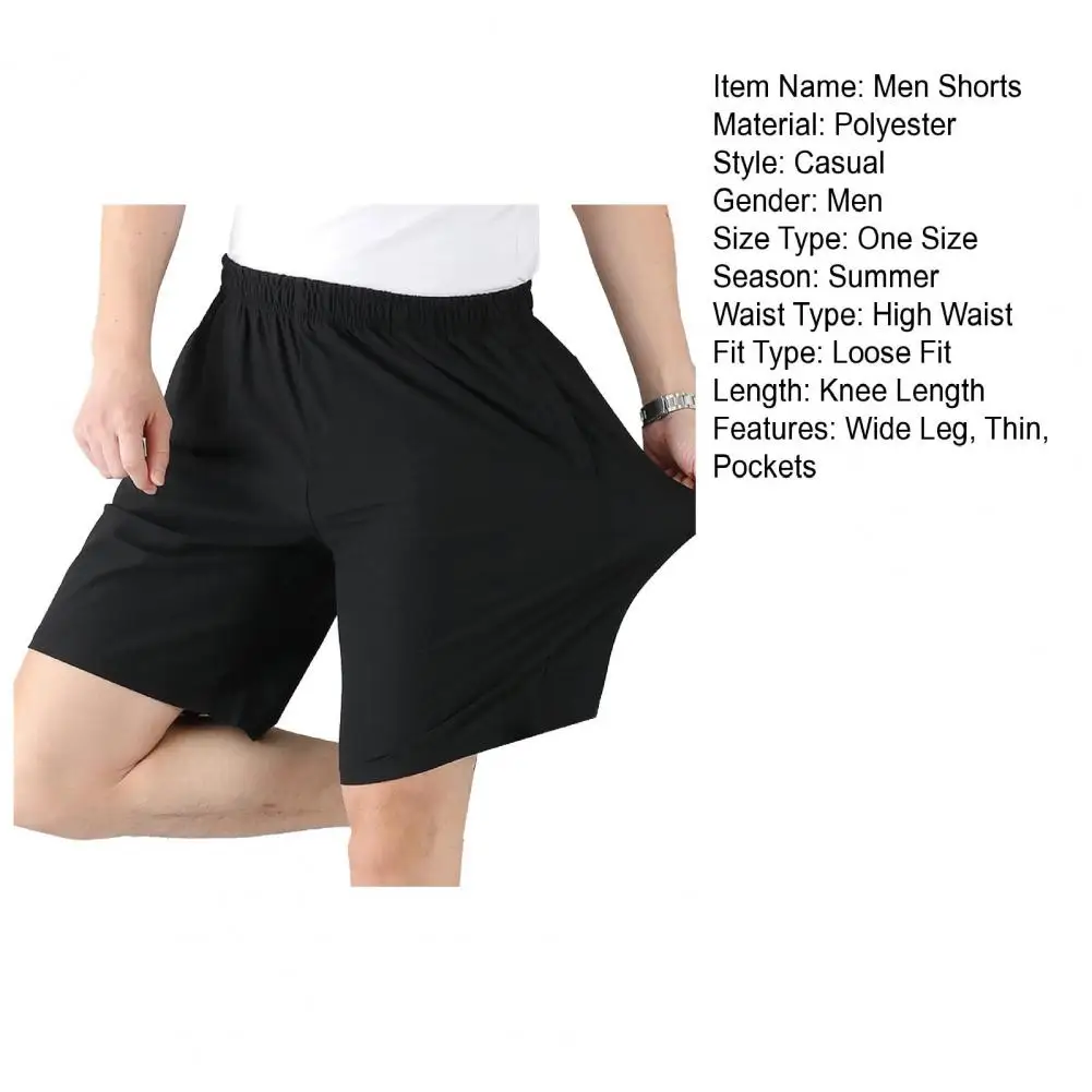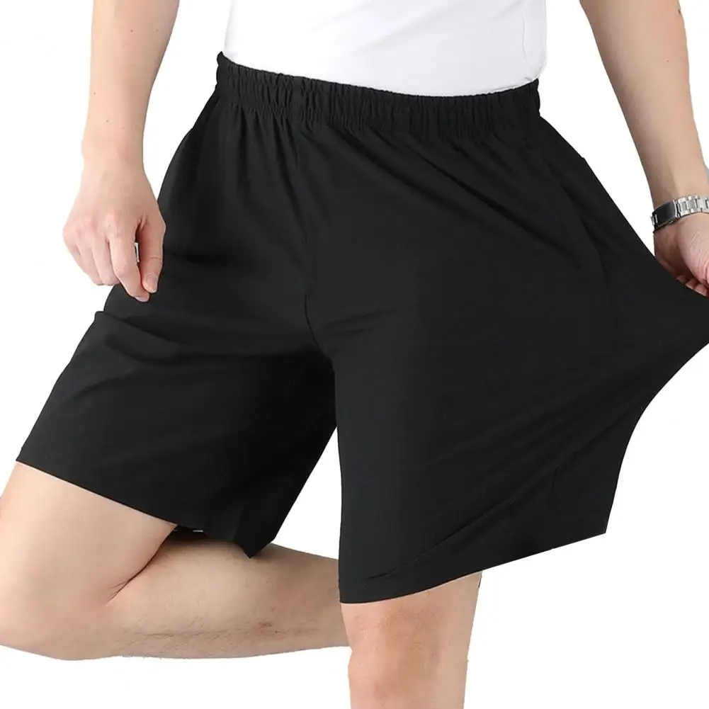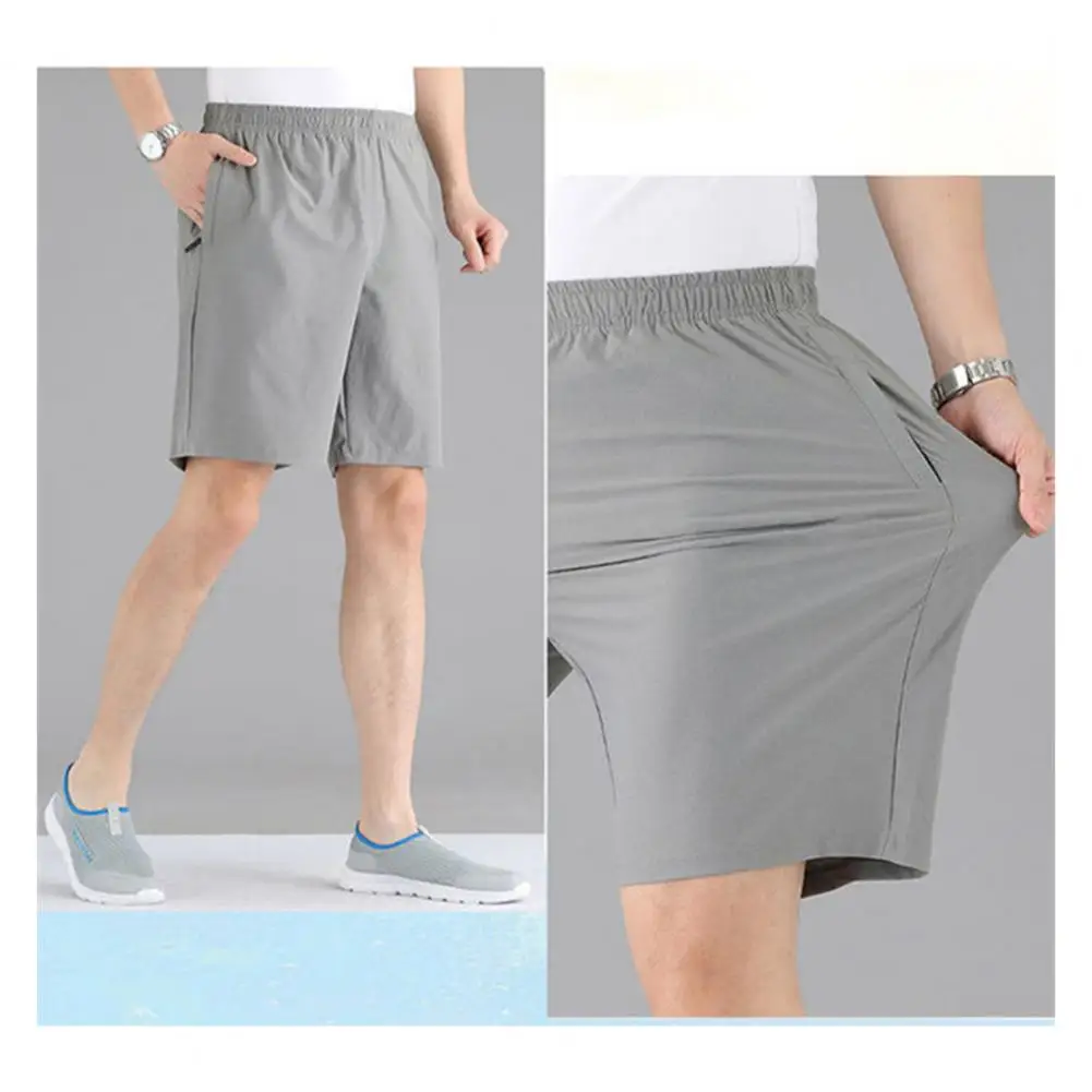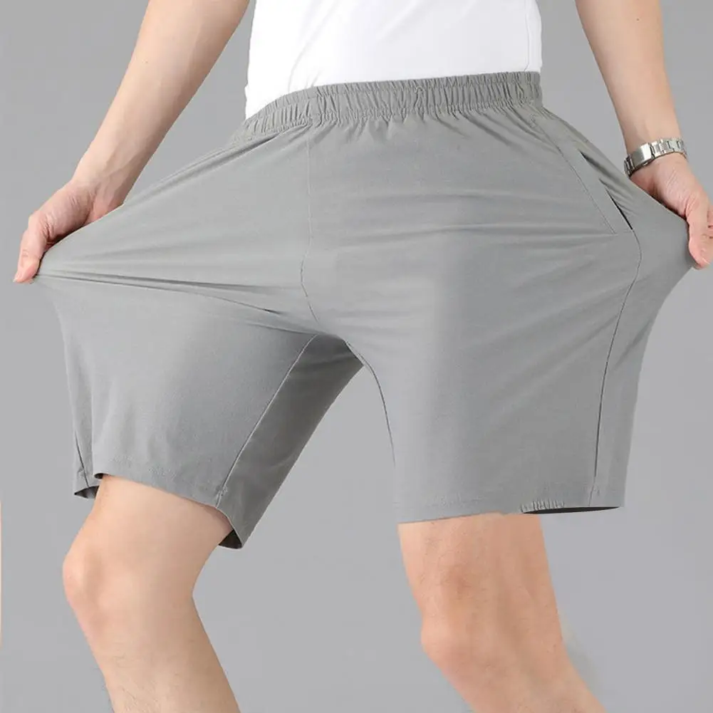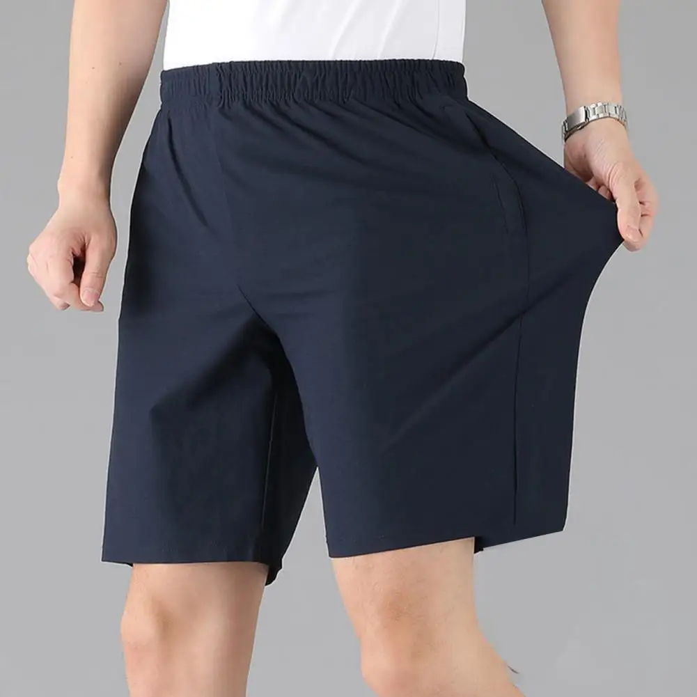 High-Waist Elastic Waistband Men Shorts Zipper Pockets Wide Leg Solid Color Mid-aged Ice Silk Sports Shorts