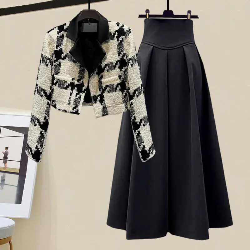 Spring and Autumn Set Women’s 2023 New Korean Edition High End Plaid Suit Top Slim and Versatile Half Skirt Two Piece Set