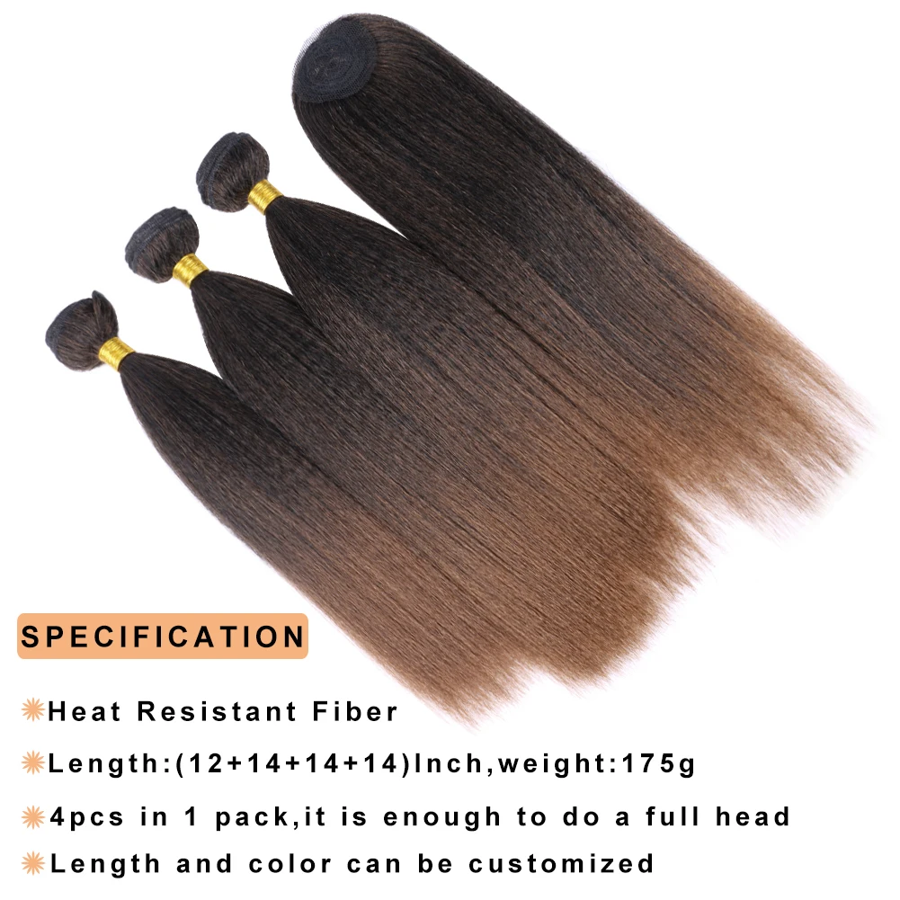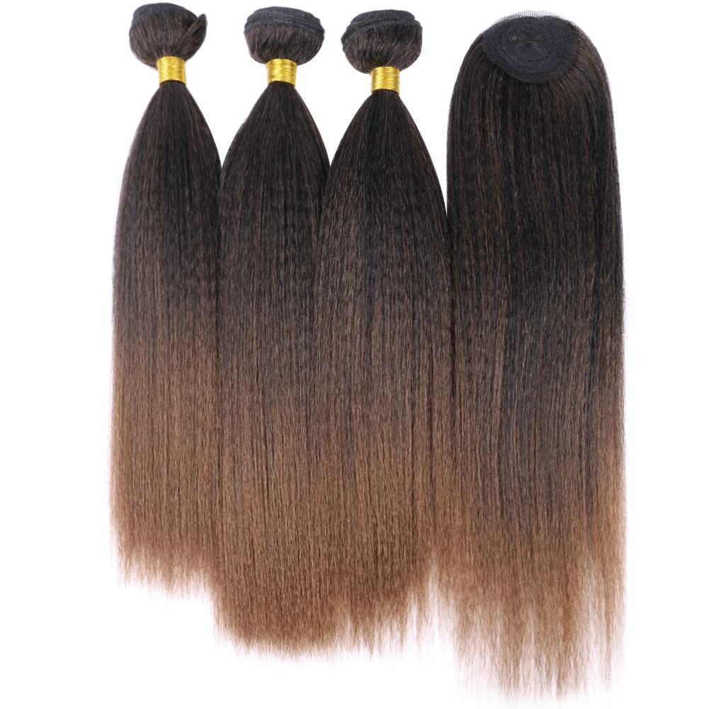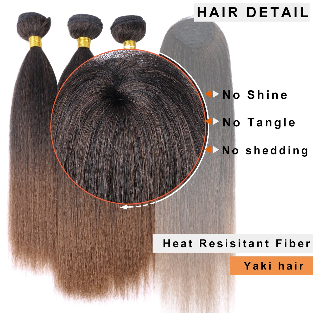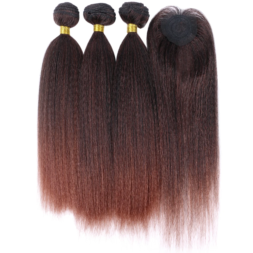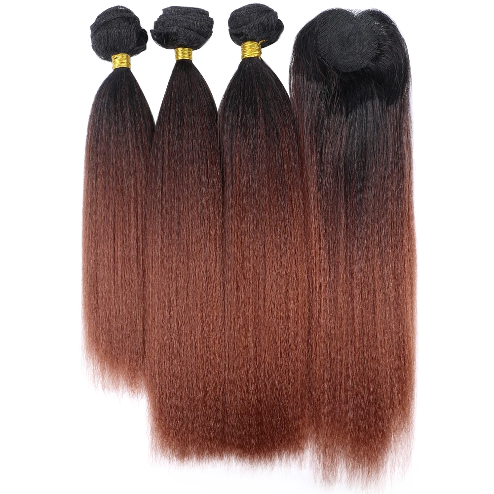 Synthetic Kinky Yaki Straight Hair Weave Bundles With Closure Heat Resisitant Fiber Black Ombre Brown Hair Extensions For Women