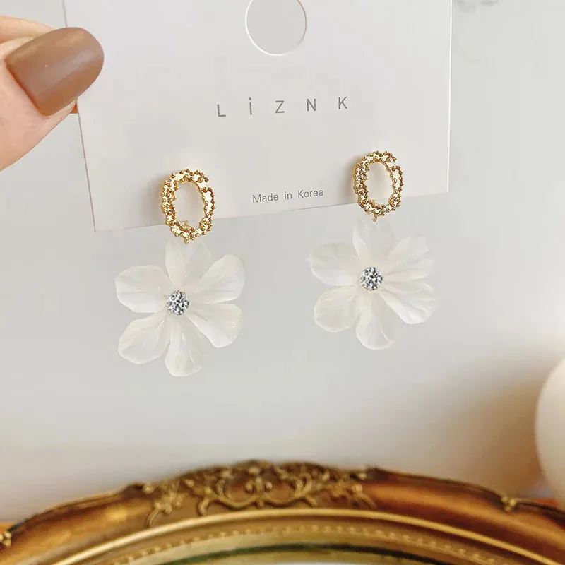 Translucent White Flower Hanging Earrings for Women Rhinestone Ball Middle Petals Sweet Korean New Beach Vacation Ear Decoration